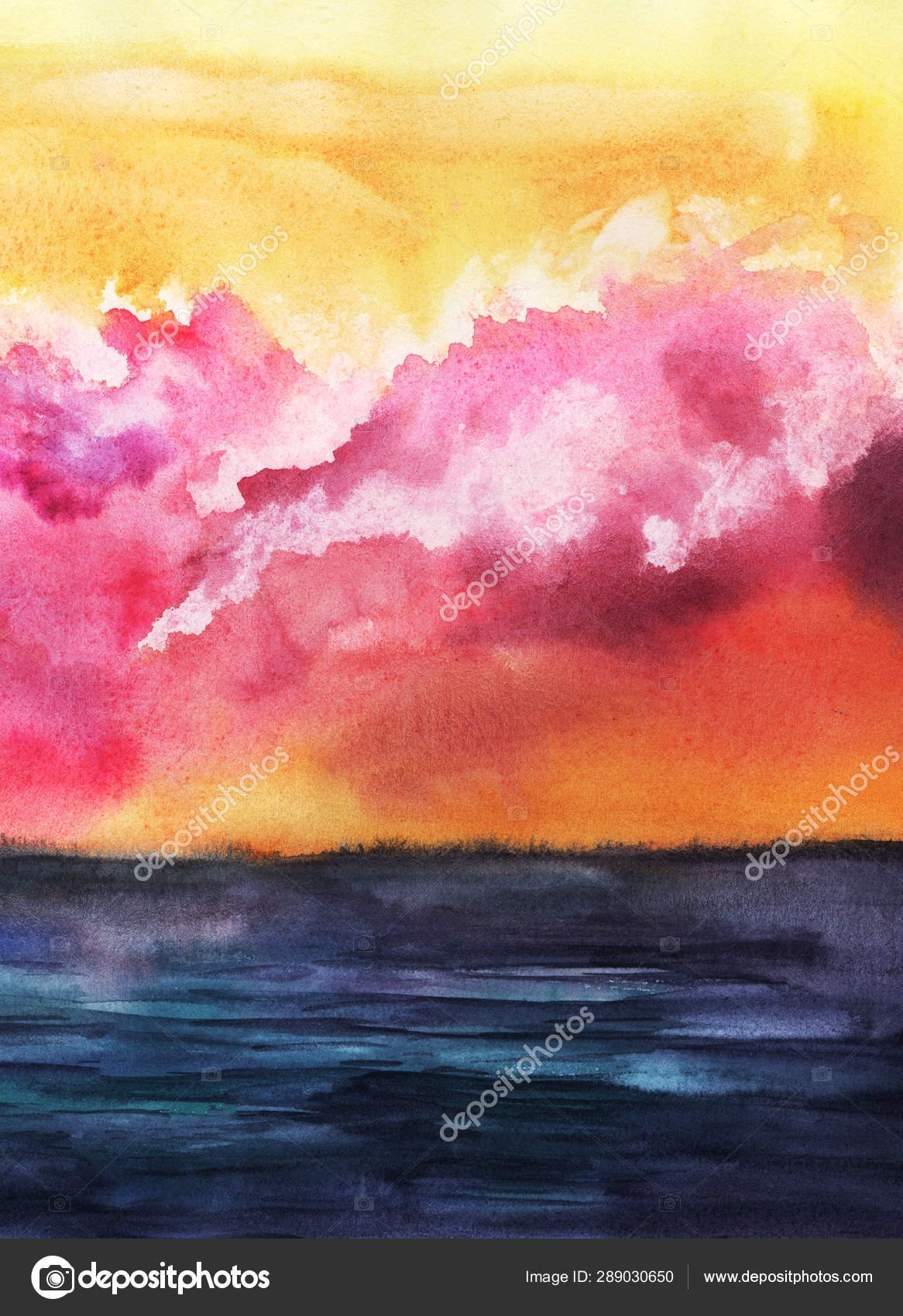 Colorful Hand Drawn Seascape Fiery Aurora Sunset Soft Pink Lilac