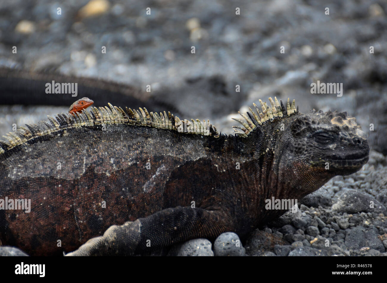 Marine Iguana In The Galapagos Islands With Baby On Its Back Stock