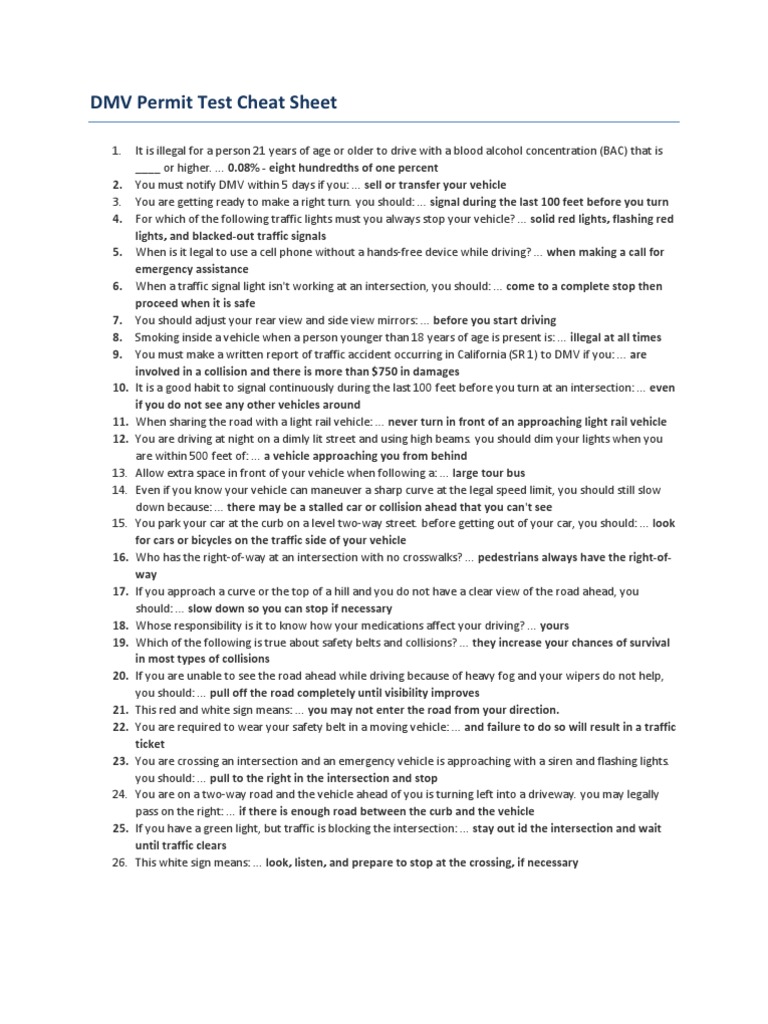 Drivers Test Cheat Sheet California
