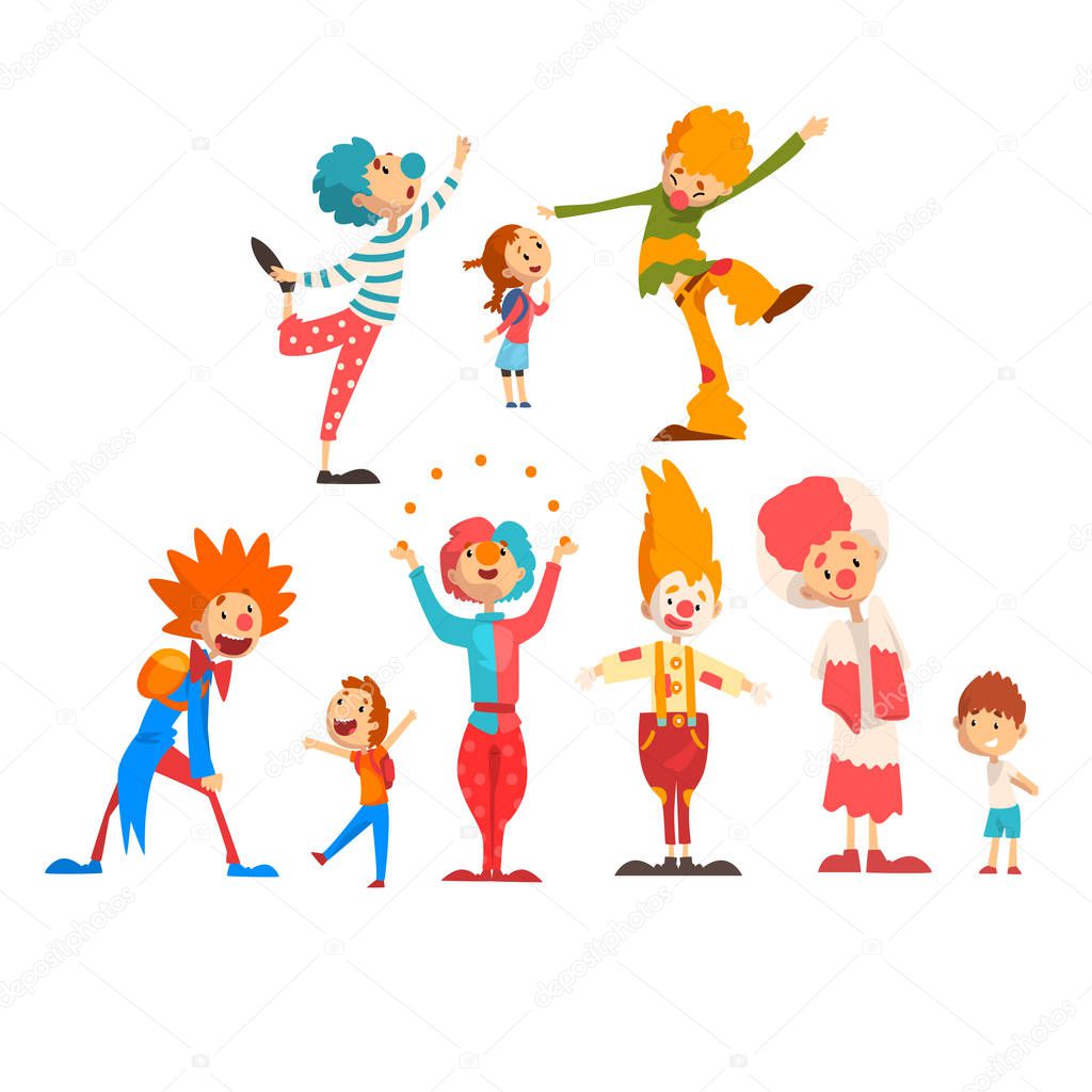 Cute Funny Clowns And Happy Kids Set Boys And Girls Having Fun