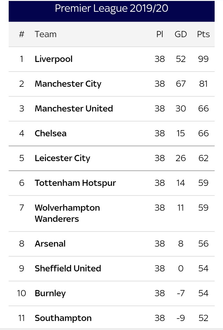 Soccabet On Twitter Here Is The 2019 2020 Premier League Table After 38 Games On Final Day Champions League Lfc
