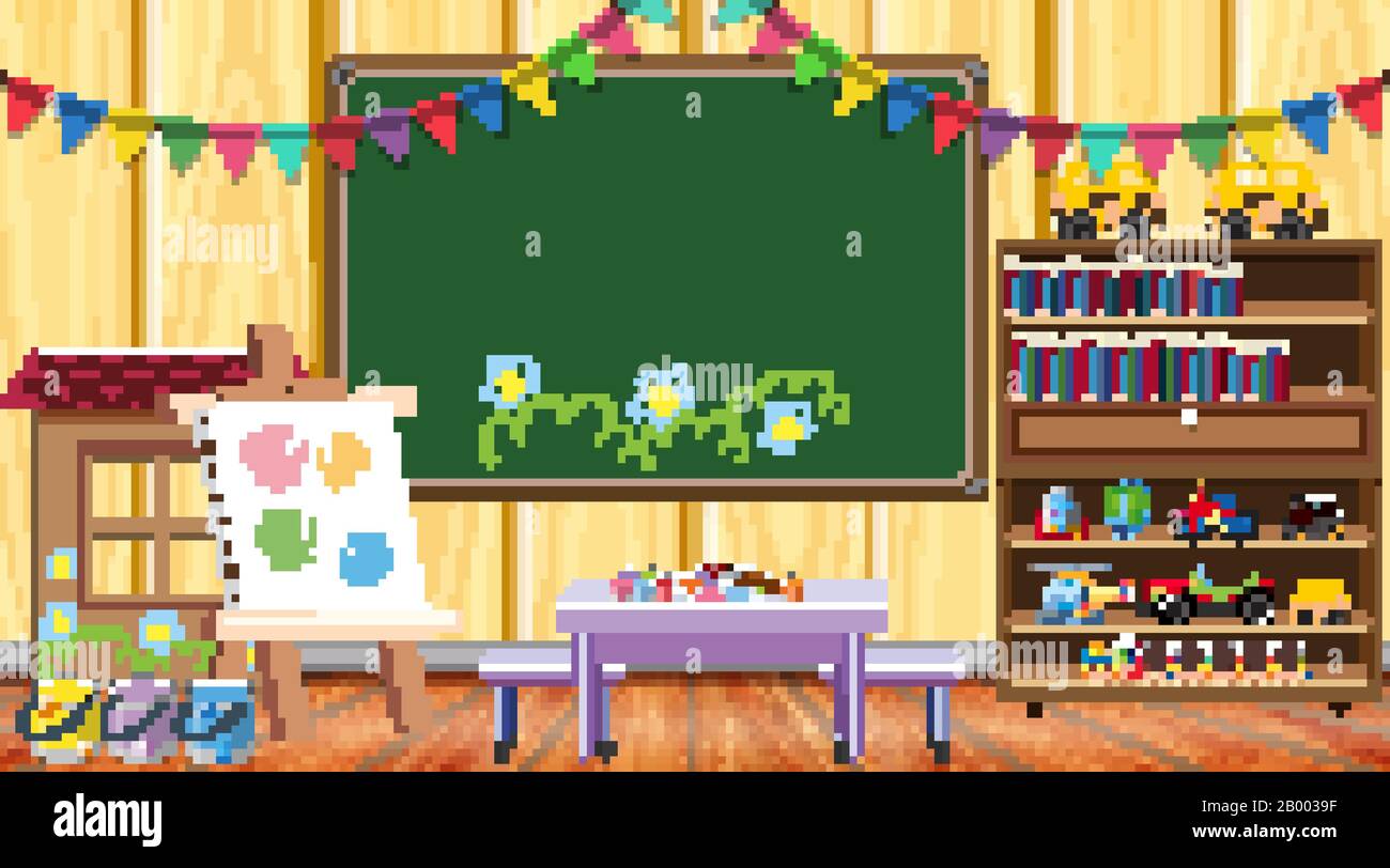 Classroom With Chalkboard And Bookshelf Illustration Stock Vector