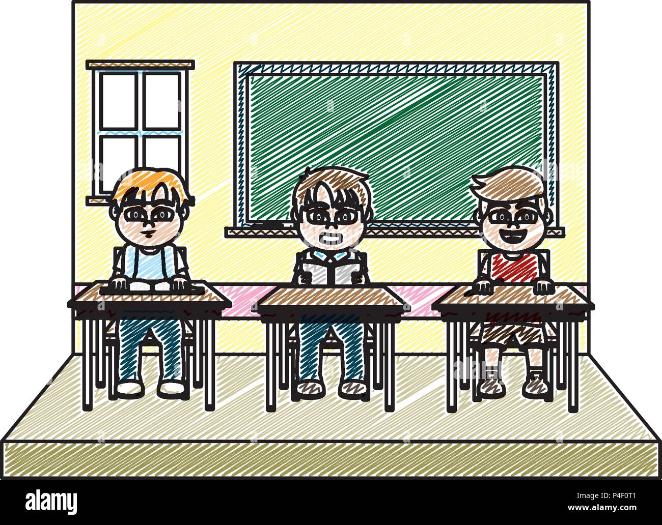 Doodle Classroom With Students Sitting School Desk Stock Vector