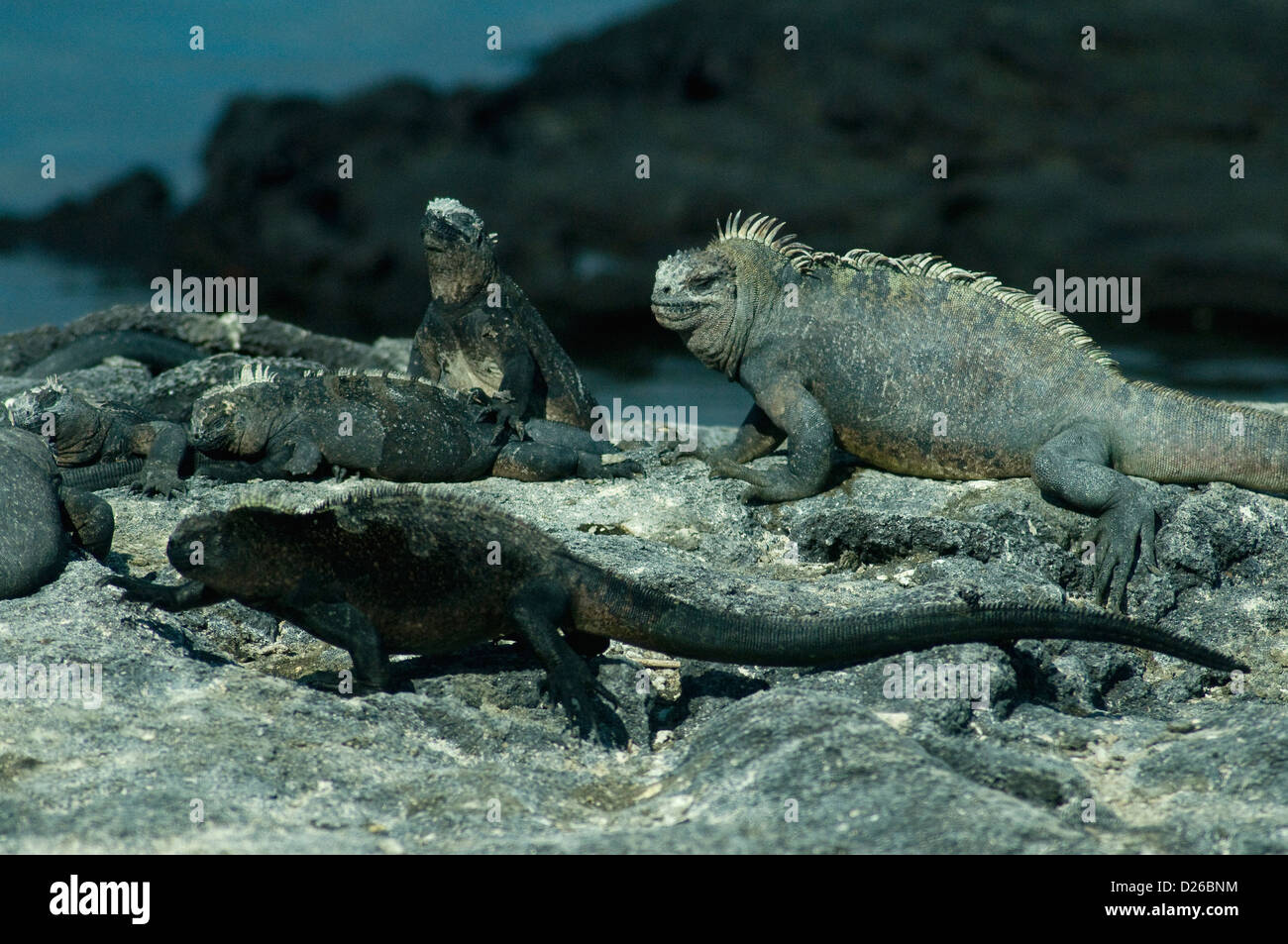 Marine Iguanas Of Various Sizes And Colours Enjoy Sea And Shore
