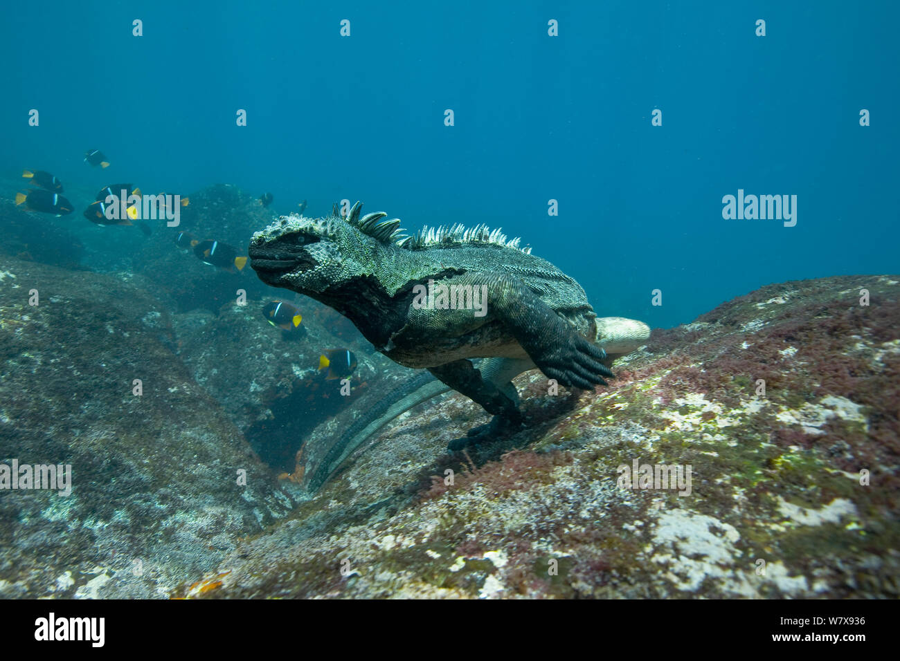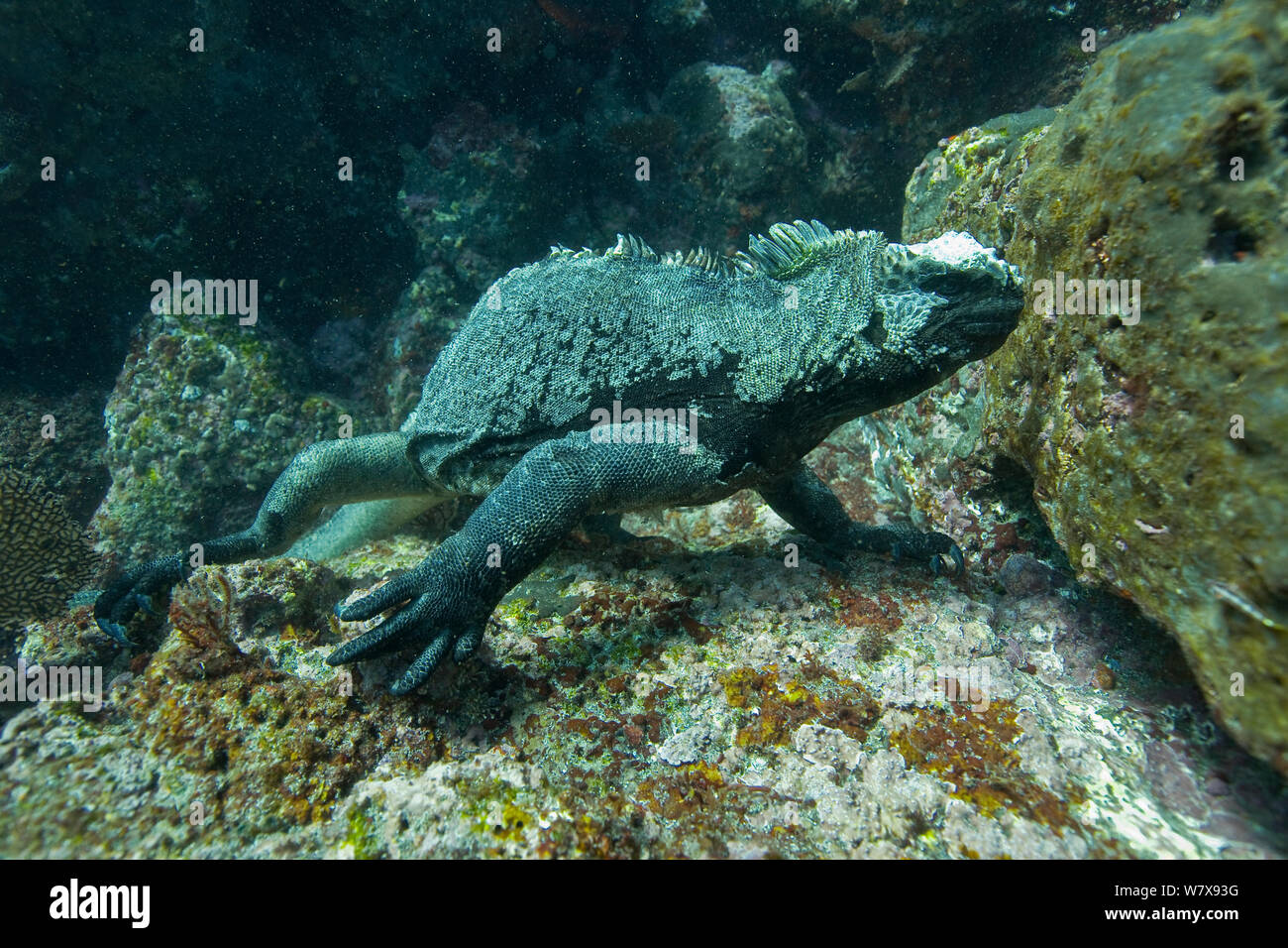 Marine Iguana Swimming At Undersea Reef Galapagos Stock Photo