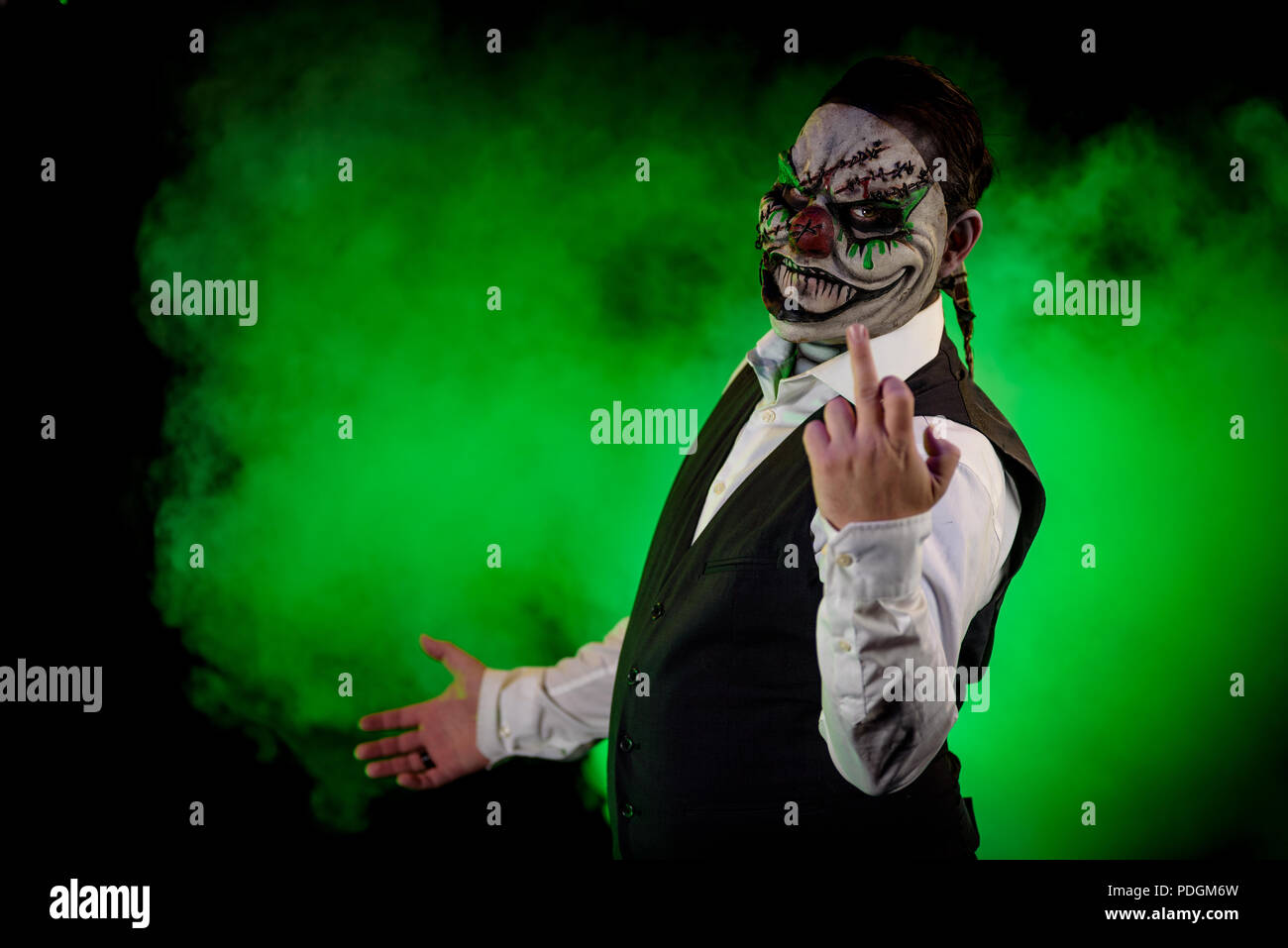 Portrait Of A Nicely Dressed Man Wearing An Evil Clown Mask With