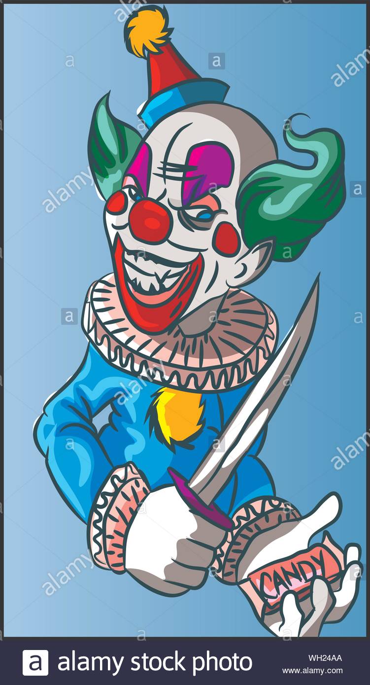 Colorful Evil Clown With Candy In His Hands And A Knife Smiling