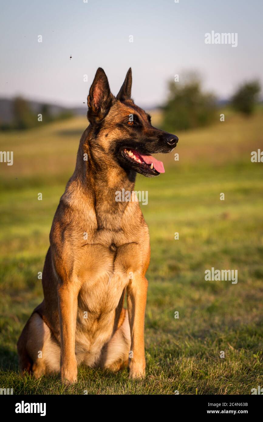 One Male Belgian Malinois Shepherd Dog Sitting Outside Stock Photo