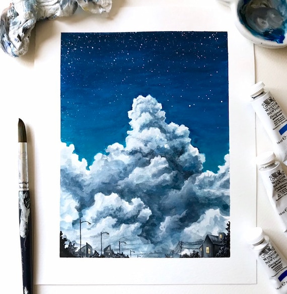Original Gouache Painting Handmade Painting Nighttime Clouds Etsy