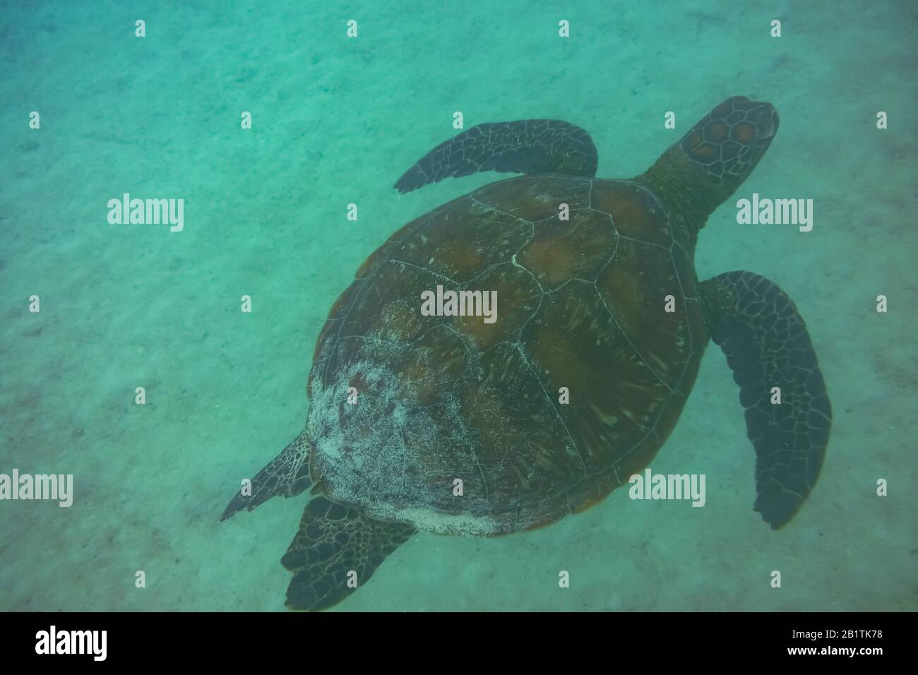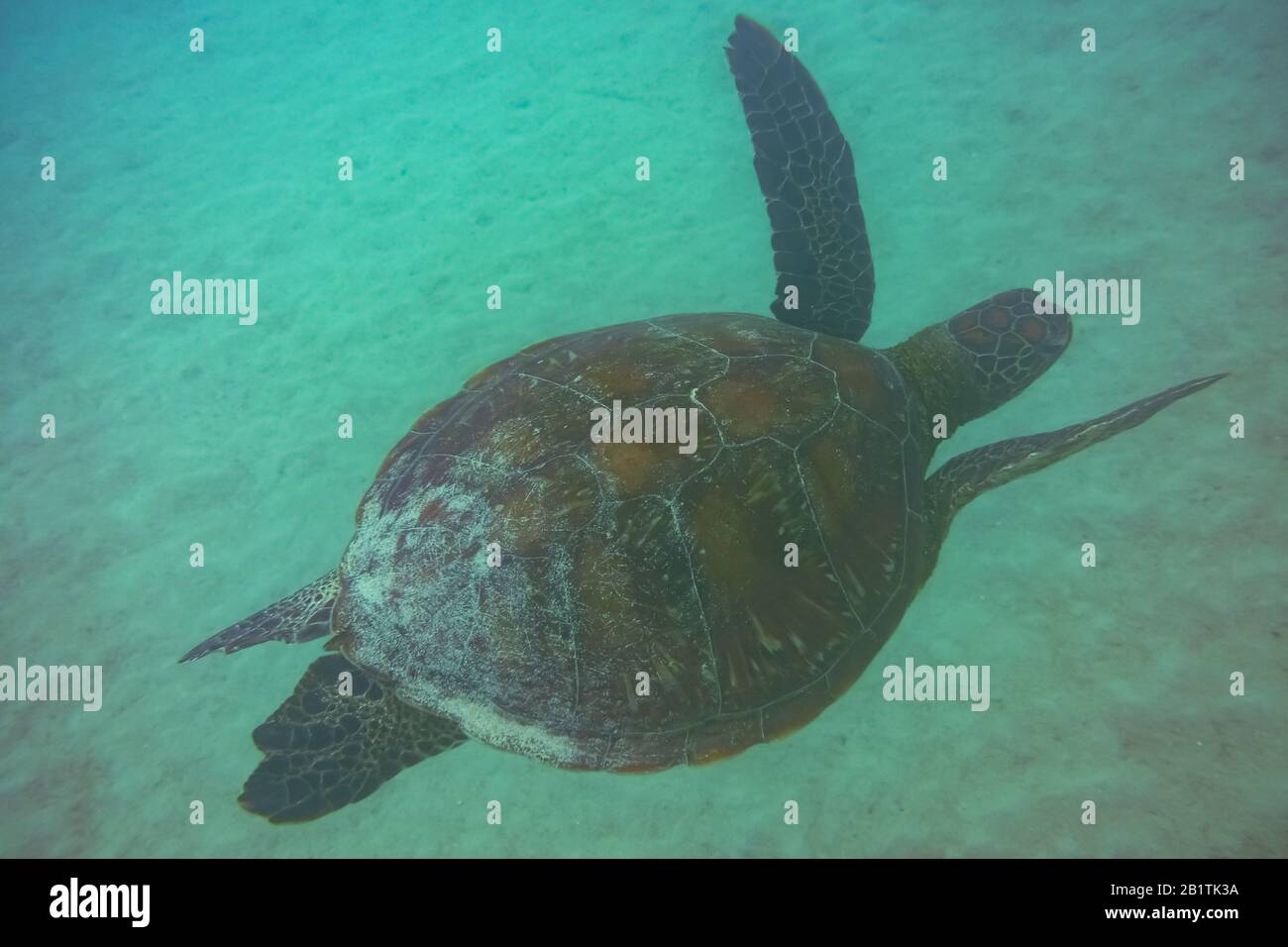 Green Sea Turtle Chelonia Mydas Swimming Underwater In The