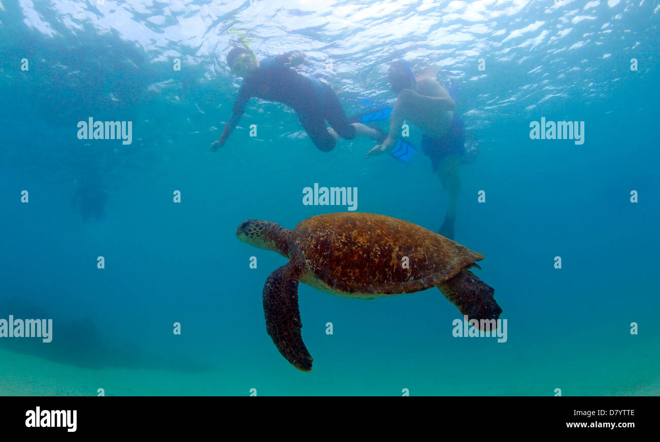 Sea Turtle And Snorkelers Underwater Galapagos Islands Stock